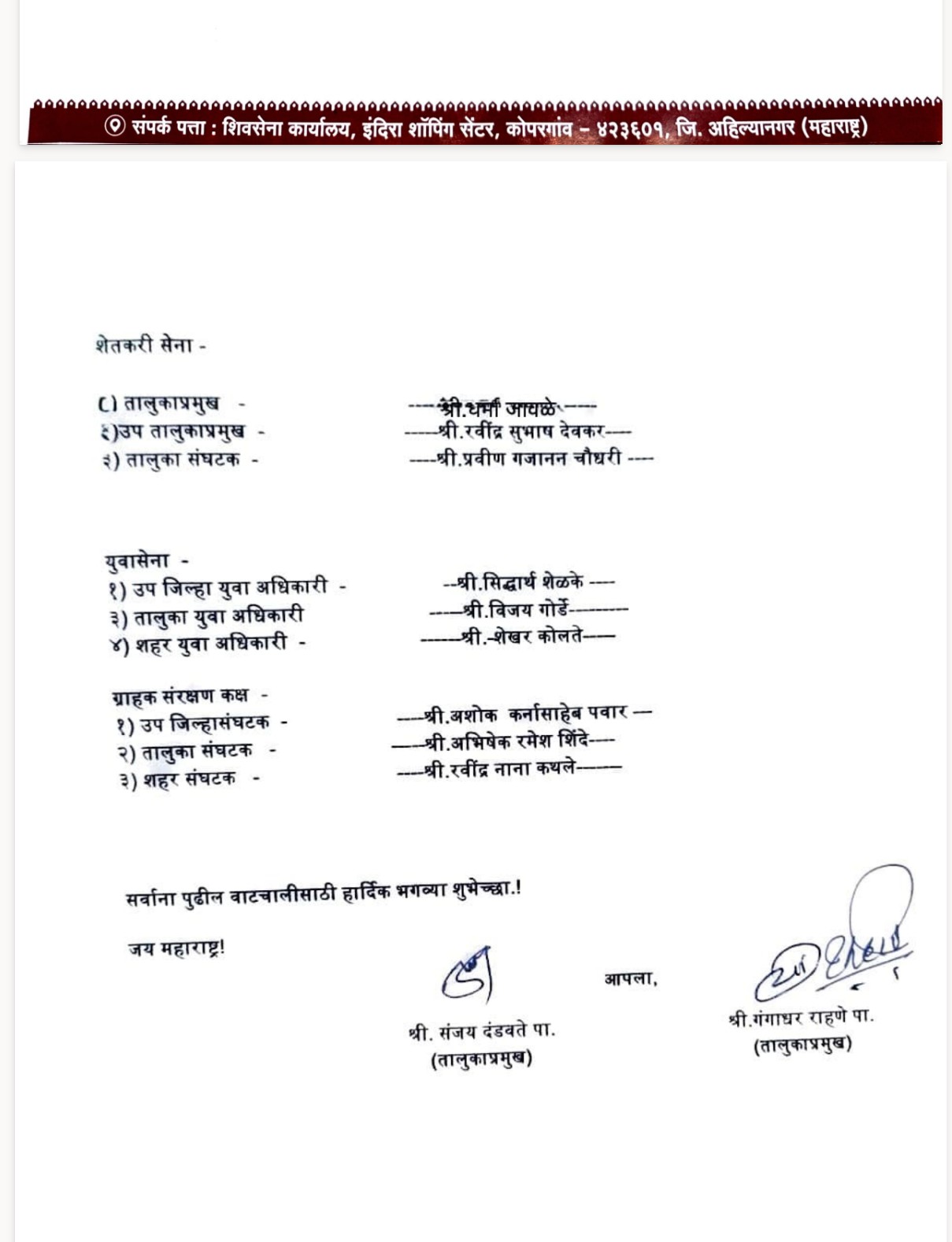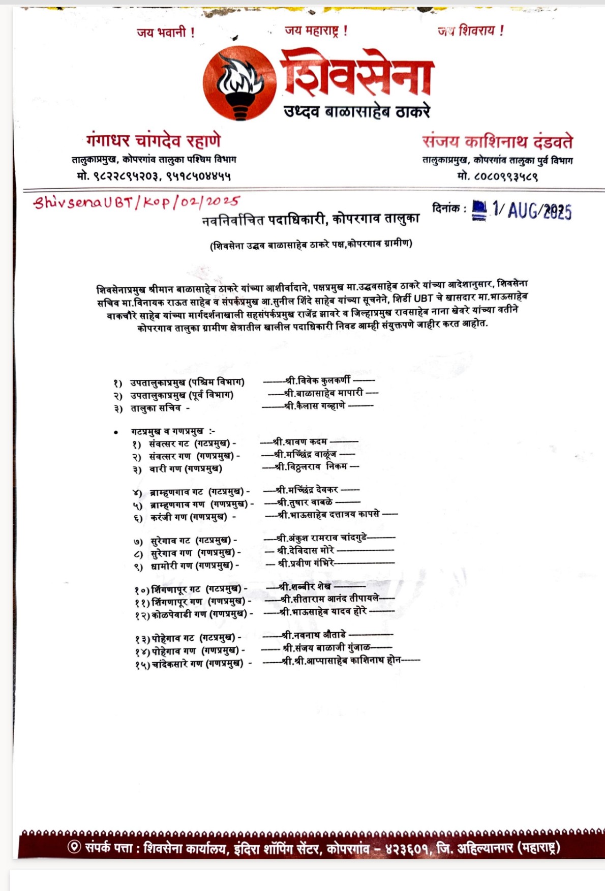 पूर्व विभाग); श्री. विवेक कुलकर्णी (उपतालुकाप्रमुख, पश्चिम विभाग); श्री. कैलास गव्हाणे (तालुका सचिव); यासंह गटप्रमुख अनुक्रमे श्री. श्रावण कदम (संवत्सर गट); श्री. मच्छिन्द्र देवकर (ब्राम्हणगाव गट); श्री. अंकुश चांदगुडे (सुरेगाव गट); श्री. शब्बीर शेख (शिंगणापूर गट); श्री. नवनाथ औताडे (पोहेगाव गट) यांच्यासह 10 गणातील गणप्रमुख अनुक्रमे श्री. मछिंद्र वाळुंज (संवत्सर गण); श्री. विठ्ठल निकम (वारी गण); श्री. तुषार वाबळे (ब्राम्हणगाव गण); श्री. भाऊसाहेब दत्तात्रय कापसे (करंजी गण); श्री. देविदास मोरे (सुरेगाव गण); श्री. प्रवीण गंभीरे (धामोरी गण); श्री. सीताराम आनंद तिपायले (शिंगणापूर गण); श्री. भाऊसाहेब यादव होरे (कोळपेवाडी गण); श्री. संजय बाळाजी गुंजाळ (पोहेगाव गण); श्री. अप्पासाहेब काशिनाथ होन (चांदेकसारे गण) आर्दीची निवड जाहीर केली आहे. आहे. यासंह अंगीकृत संघटनेत (युवासेना) श्री. सिद्धार्थ शेळके (उपजिल्हा युवा अधिकारी); श्री. विजय गोर्डे