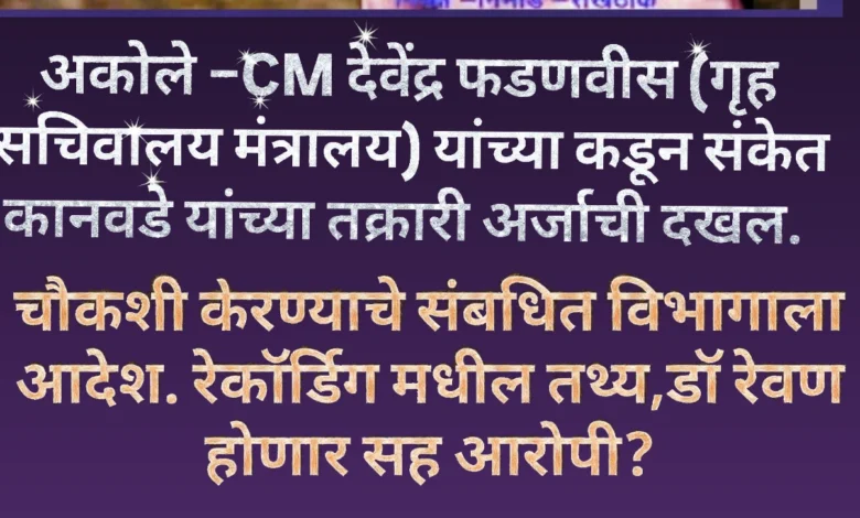 अकोले –CM देवेंद्र फडणवीस (गृह सचिवालय मंत्रालय) यांच्या कडून संकेत कानवडे यांच्या तक्रारी अर्जाची दखल. चौकशी करण्याचे संबधित विभागाला आदेश. रेकॉर्डिग मधील तथ्य,डॉ रेवण होणार सह आरोपी?