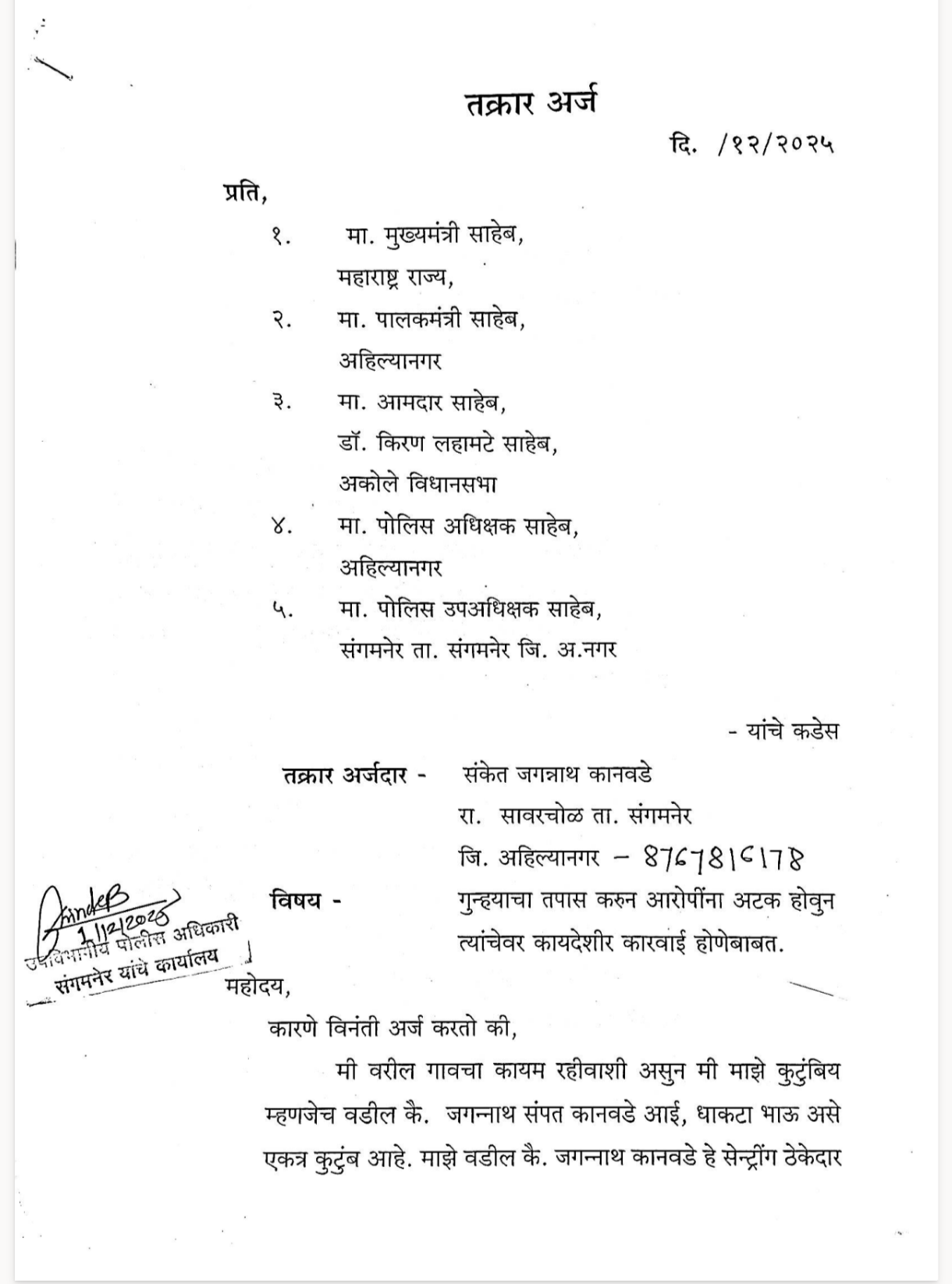 ✍️आज खऱ्या अर्थाने तक्रारी अर्ज हा मंत्रालयात गेला मुख्यमंत्री देवेंद्र फडणवीस यांनी त्या अर्जाची दखल घेतली आणि संबंधित विभागाला आदेश दिले गेले. यावरून कुठेतरी मयत जगन्नाथ कानवडे यांच्या कुटुंबाला न्याय मिळेल याची आशा आता वाटू लागली आहे..