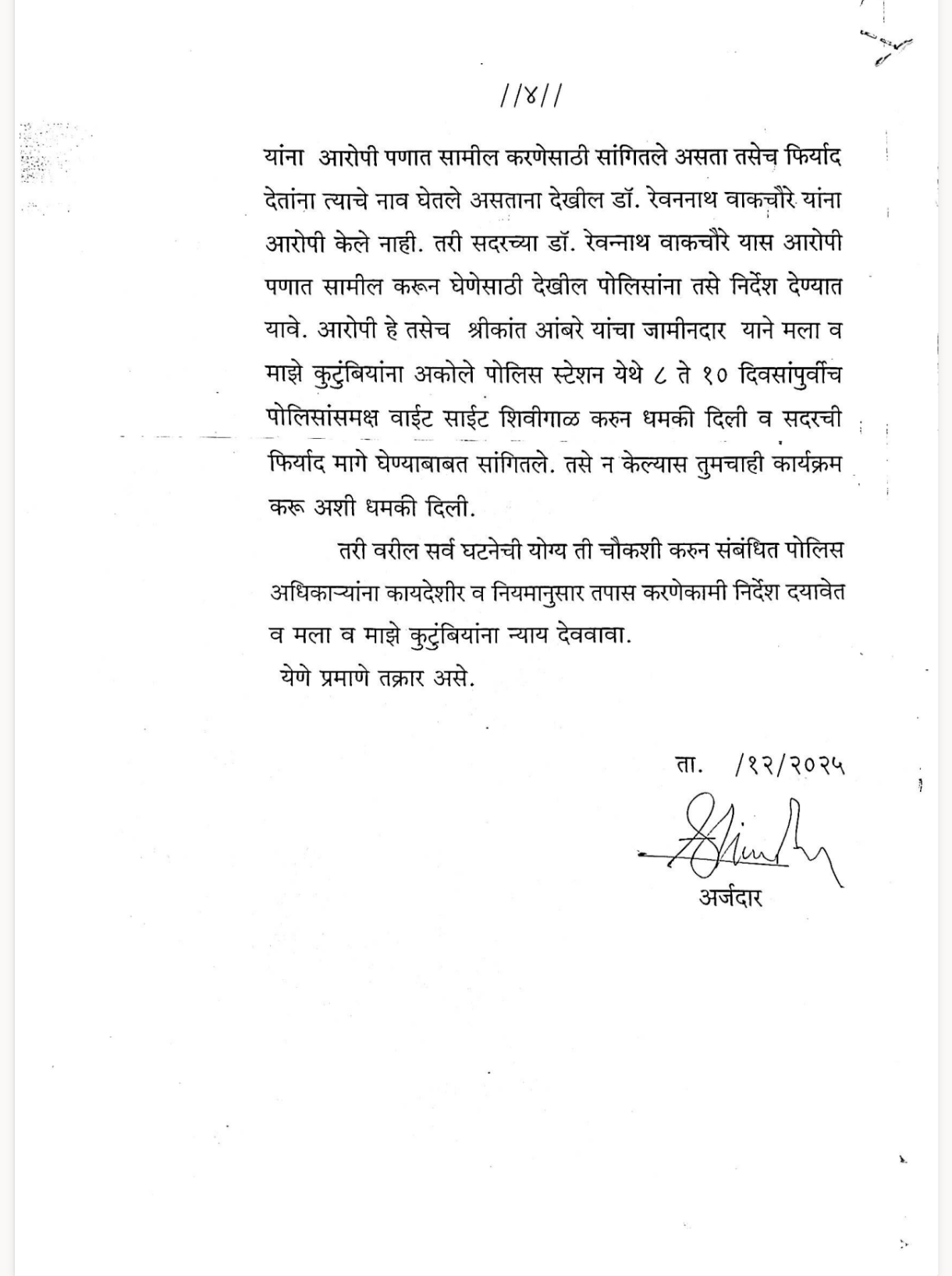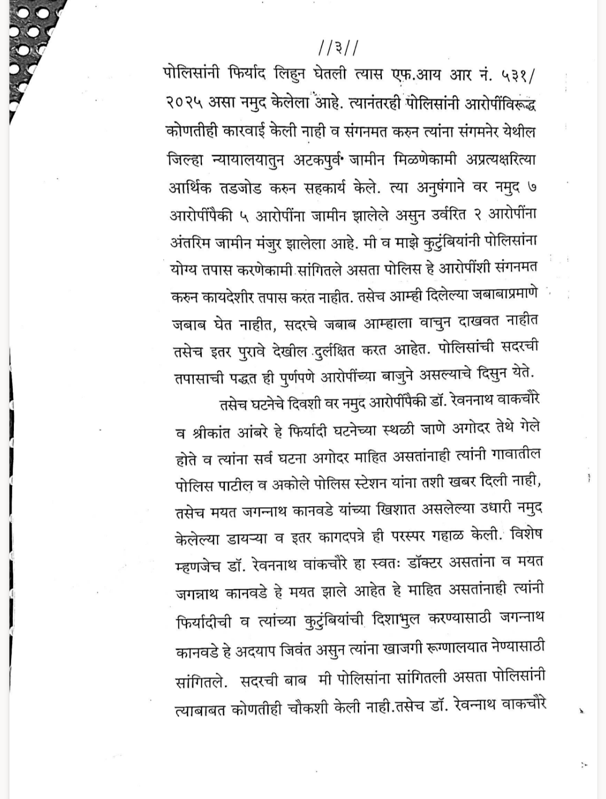 डॉ रेवण वाकचौरे विरोधात मयत जगन्नाथ कानवडे चे नातेवाईक आक्रमक–पोलिसांवर गंभीर आरोप. DYSP ,SP सह मुख्यमंत्री पालकमंत्र्यांना तक्रारी अर्ज.✍️आरोपी तसेच डॉ रेवण सोबत पोलिसाचे संगनमंत. डॉ रेवण ला आरोपी करा तक्रारी अर्जात नमूद.*